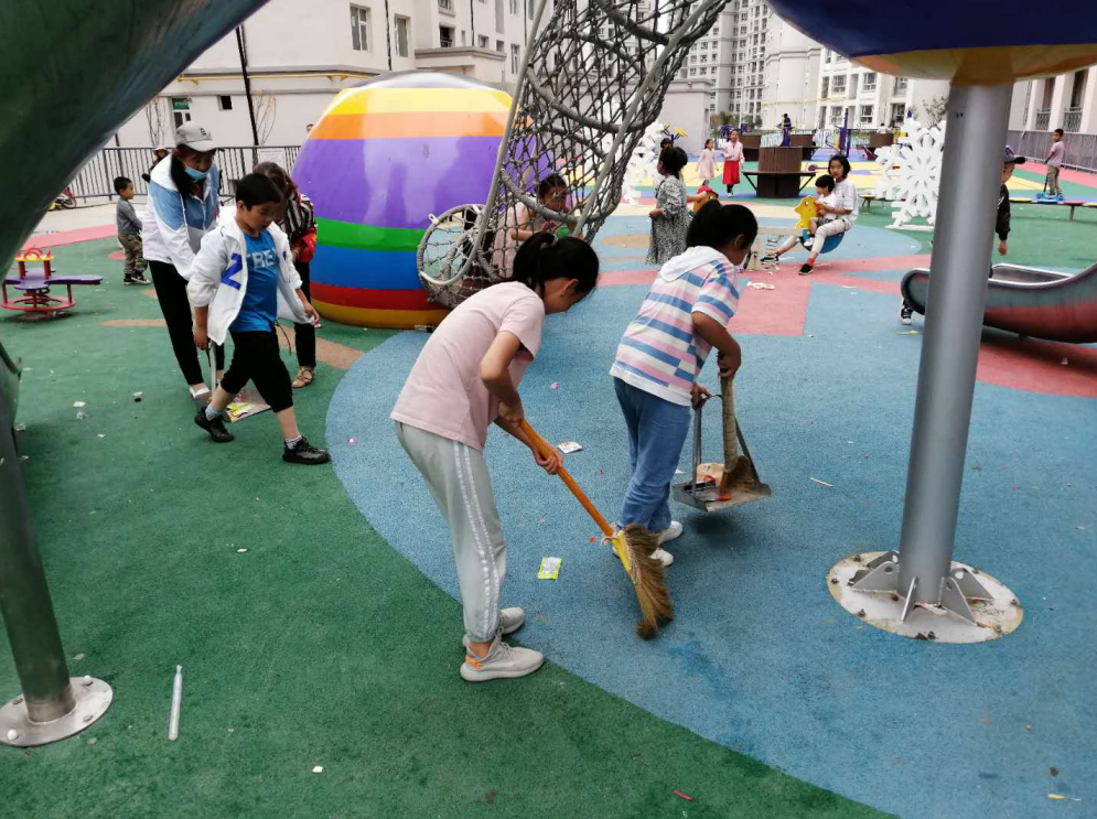 开展“我为社区做贡献”环境卫生志愿服务活动。“我拿扫帚,你拿簸箕,我俩去健身器材那儿打扫。”韵城小区体育小游园的广场上聚集着一群“环保小卫士”,他们是韵家口镇东盛社区的工作人员和一群青少年志愿者,正在开展每月一次的环境卫生志愿服务活动。他们有的拿着扫帚在清扫地上的垃圾,有的拿着抹布在擦拭健身器材,有的捡拾绿化带里的烟头、纸屑,经过两个多小时的努力,小区内广场、健身器材、周边环境焕然一新。虽然志愿者们干得汗流浃背,但看到健身器材被擦的干净明亮,游乐设施和平台打扫的干干净净,劳动成果有了回报,孩子们的脸上都露出了开心的笑容。环境卫生志愿服务活动的开展,不仅丰富了青少年的暑假生活,培养青少年关爱自然、保护生活环境的美德,更进一步增强了他们的环境保护意识和服务社会的意识。