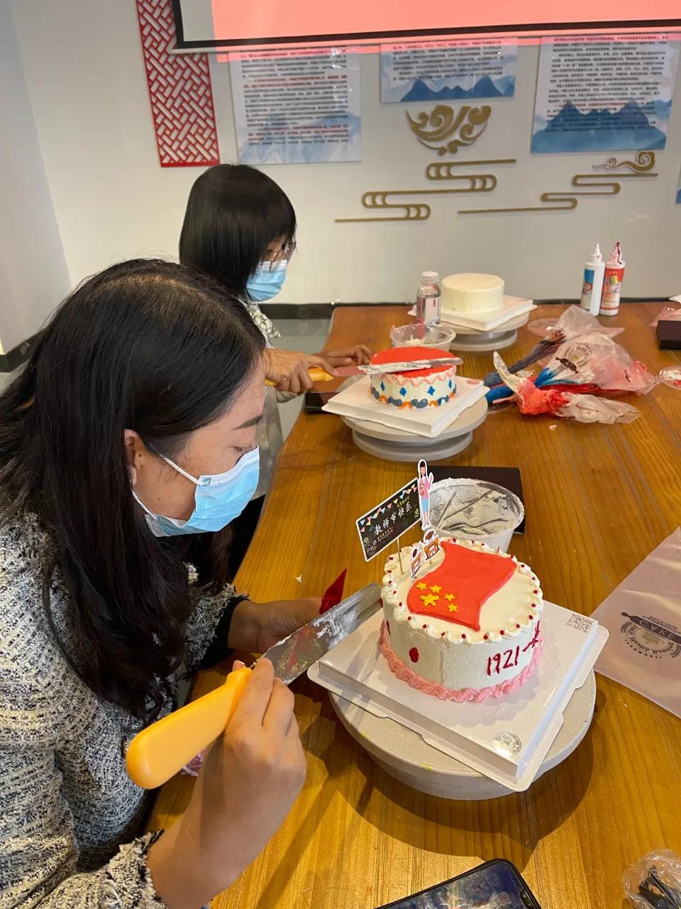 本次活动以弘扬爱党爱国精神为主题,旨在引导党员教师以党史学习教育为契机,立足自身岗位,履行好教书育人的使命和职责,增强我区教职工的凝聚力和奋斗力。活动中,参与人员把五星红旗、党徽等红色元素,融入到制作蛋糕的过程中,把对中国共产党浓浓的深情用甜蜜的方式诠释出来,烘焙制作出多个美观又可口的蛋糕作品。让参加者既体验蛋糕制作的快乐,又充分展示爱党爱国主义情怀。各位优秀党员教师纷纷表示,要以此次蛋糕DIY活动为契机,继续发挥好党员先锋模范作用,坚持党的教育方针,把教育事业作为终身课题和伟大工程,始终站在培养下一代的最前线。