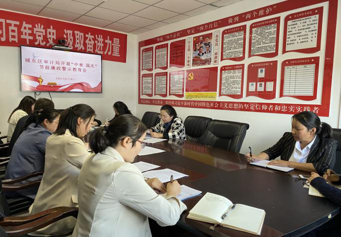 2021年中秋、国庆两节将至,为深入贯彻落实中央八项规定和省市区作风建设的相关规定精神,进一步增强干部职工廉洁自律意识,提高干部队伍整体素质,切实筑牢拒腐防变思想道德防线,城东区审计局开展了廉政风险“月月谈”、廉政“自省日”主题活动,为干部职工在节前敲响“警示钟”、提高“免疫力”、筑牢“防火墙”。