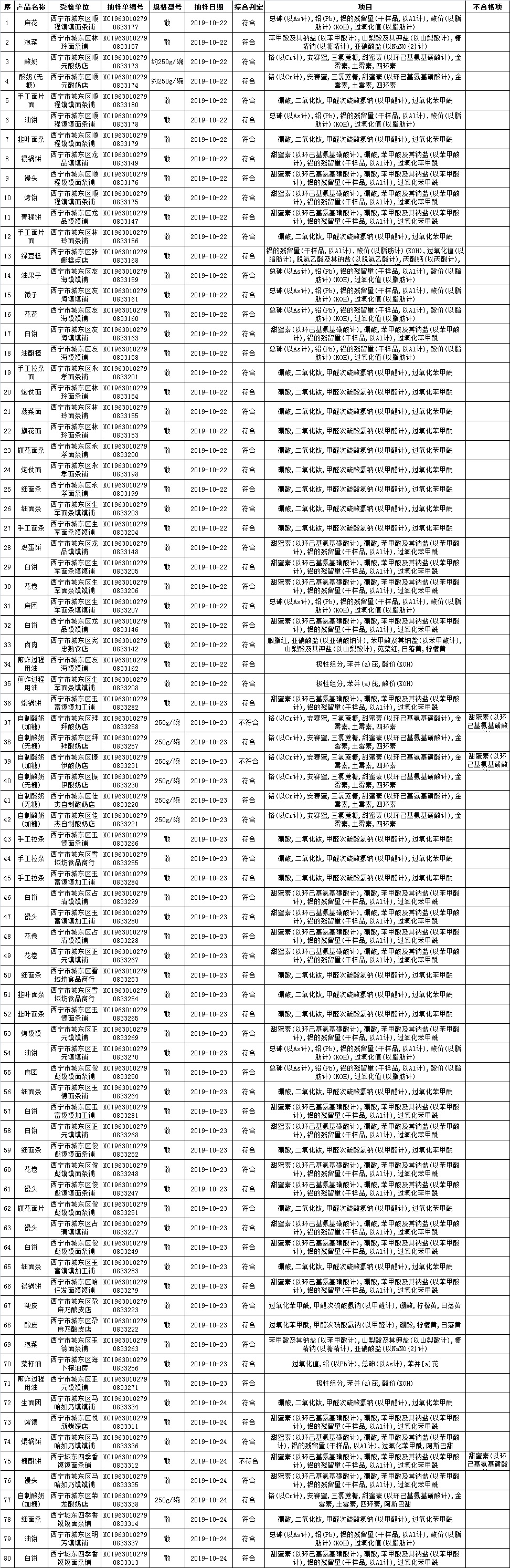 西宁市城东区市场监督管理局2019年10月食品监督抽检公示表